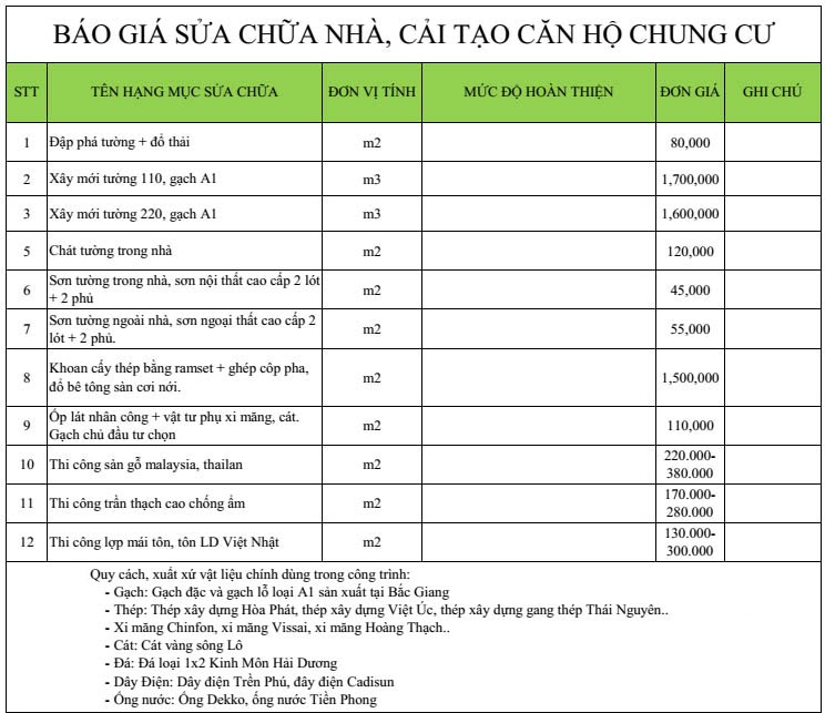 yêu cầu cụ thể để đưa ra biện pháp thi công, mức giá và tiến độ thi công tốt nhất cho các bạn ( Thời gian báo giá